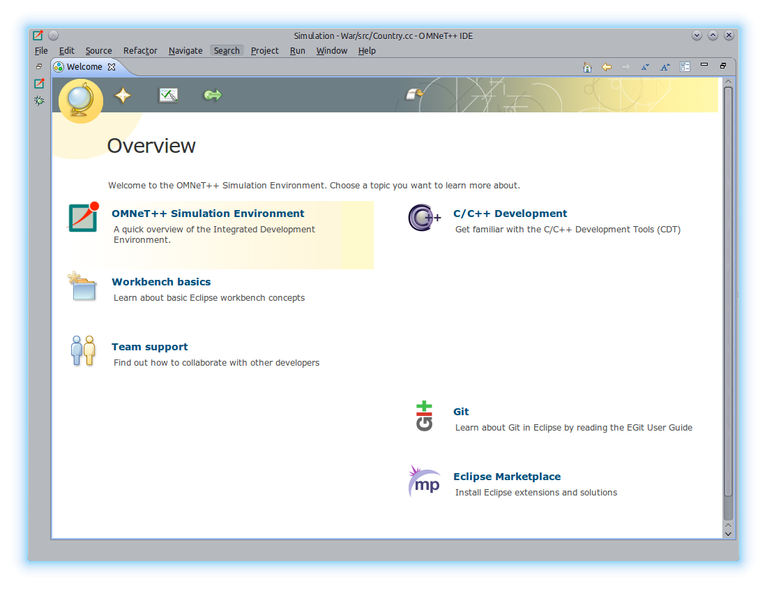 When you first run the program you are presented with a welcome screen. If you are familiar with the Eclipse IDE then you will be right at home. You have links to the documentation and also to a tutorial called Tic-Toc. This is an excellent place to start and was where I dove in. The model is very simple, but serves as an introduction, it has two nodes which pass a message between each other. It just tic-tocs back and forth and you can see this visually when you run the simulation. The tutorial is quite progressive though and by the end you have a multi node message passing model with statistic gathering. Along the way you learn the main elements of writing a simulation.