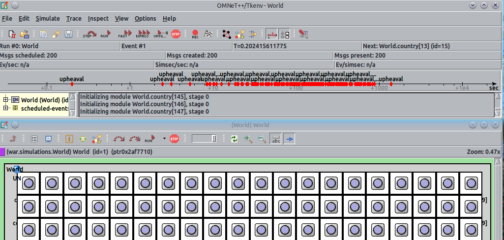 Watching the empires grow and shrink is quite mesmerising (or maybe I am just sad). By looking through the documentation I found out how to change the icon and the background dynamically of a node. So each empire has a colour and the icon shows if it is planning to launch a war, retaliate or is peaceful. This was done in about 100 lines of code and was a fun way to learn OMNeT++